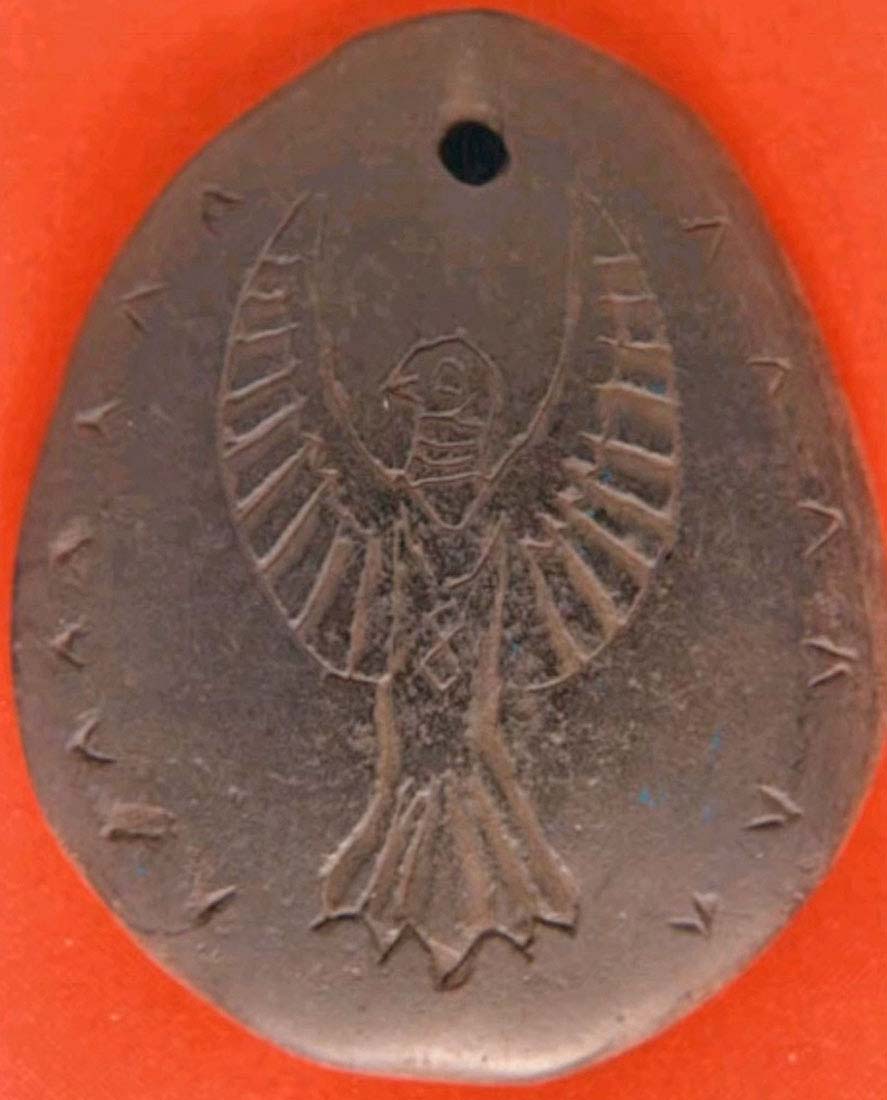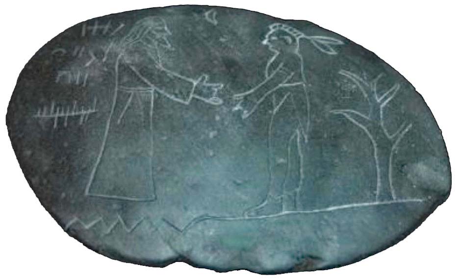 Depiction of Jesus descending (he is in mid air and feet are not shown) and extending a hand to the man with the feather. To the right is a tree, possibly representing the tree of life. To the left is the “mystic symbol” meaning the people of God and the symbol “the right hand of God” or or “son of the right hand” or “righteousness”. The other symbol meanings are unknown.
