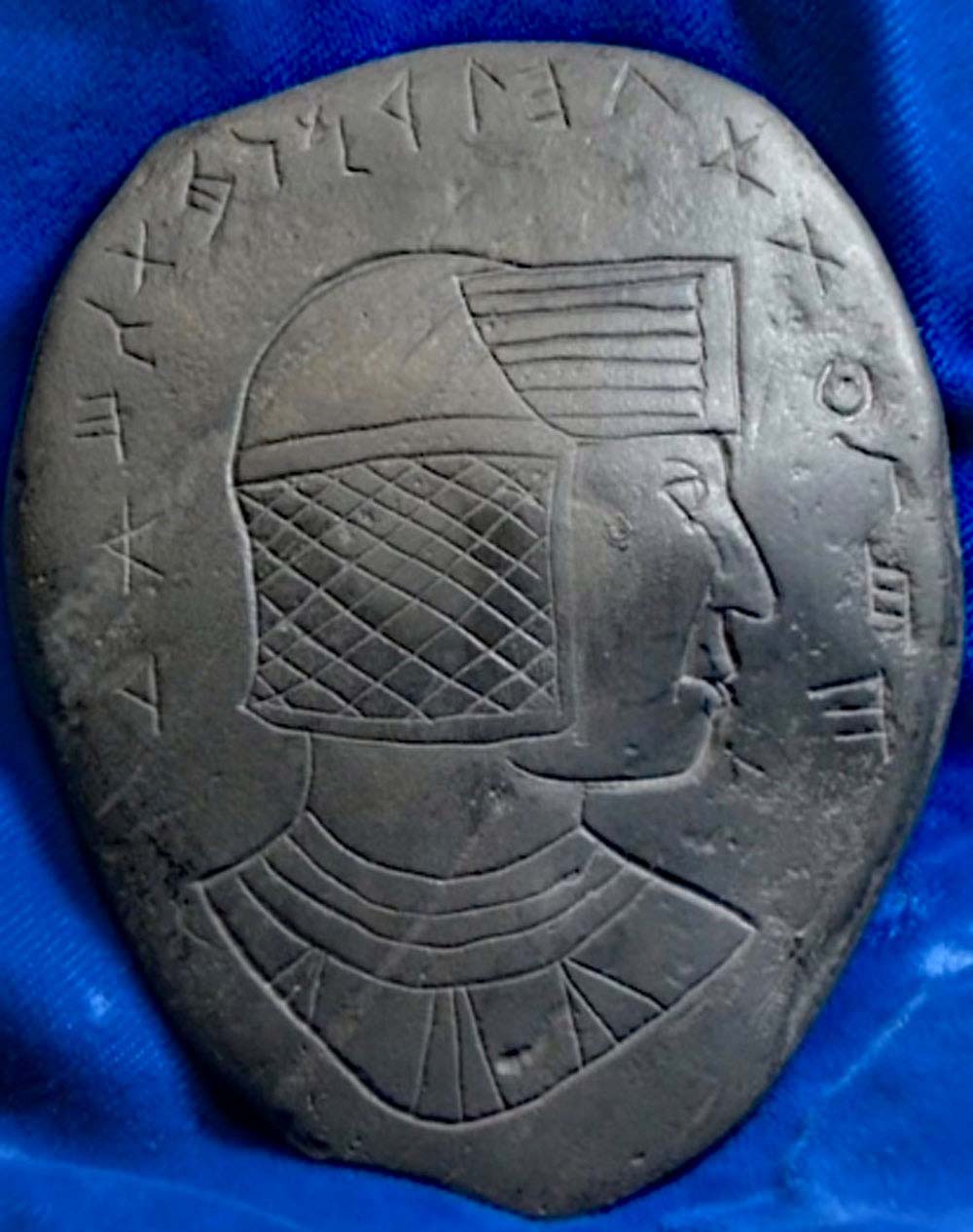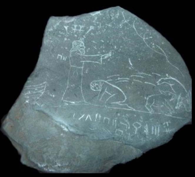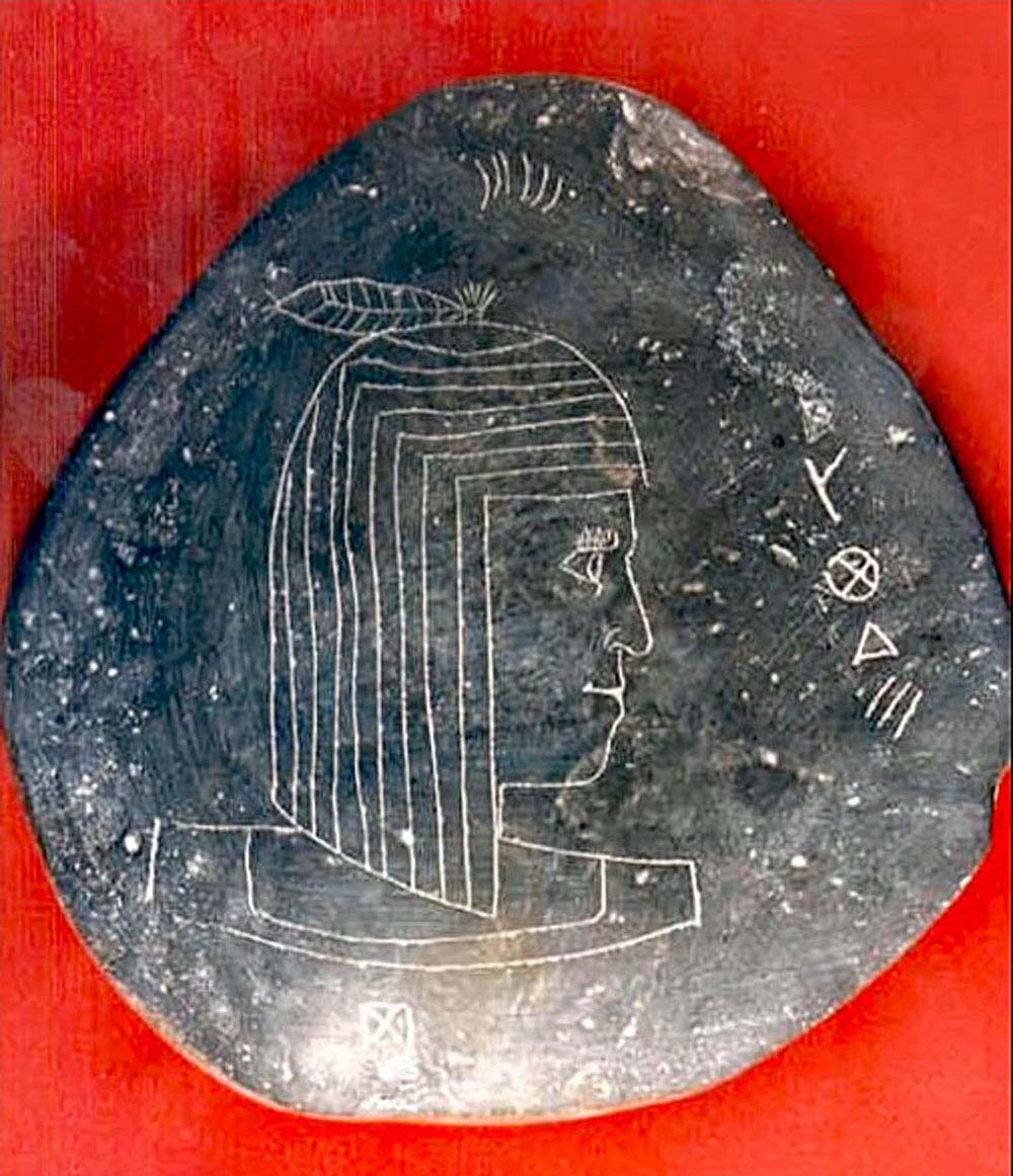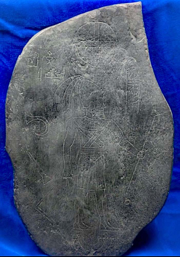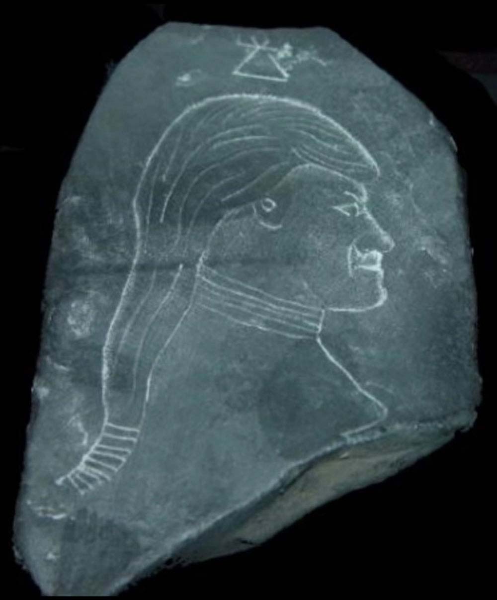 Etching of a man of authority with many Egyptian features. He wears an Egyptian crown (Uraeus) and carries a scepter in his left hand and an ankh (“life” or “key of life”) in his right hand and with a cartouche (contains a royal name) in front of him. Behind him, to the left, is a horn and trumpet. Additional unknown writing at the top.