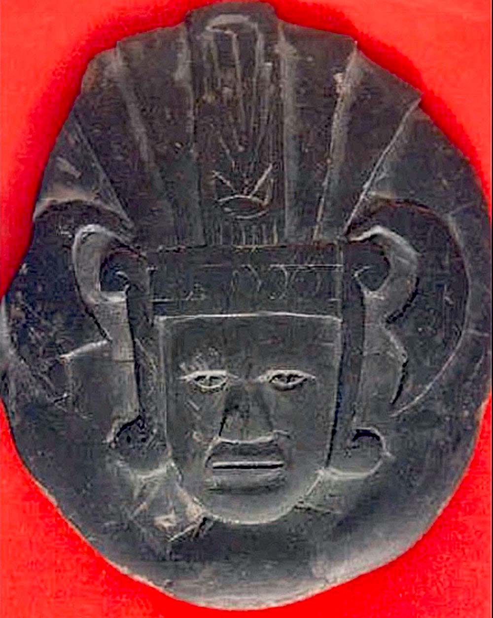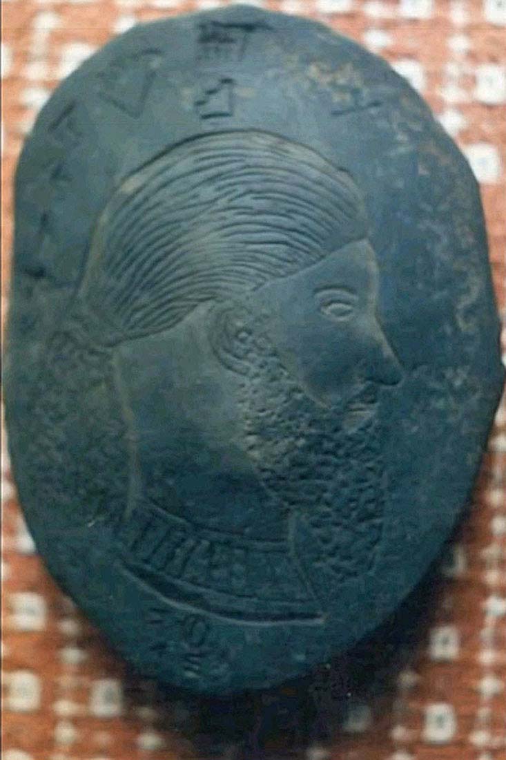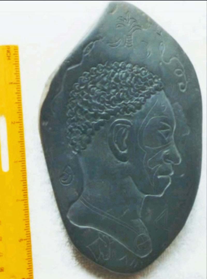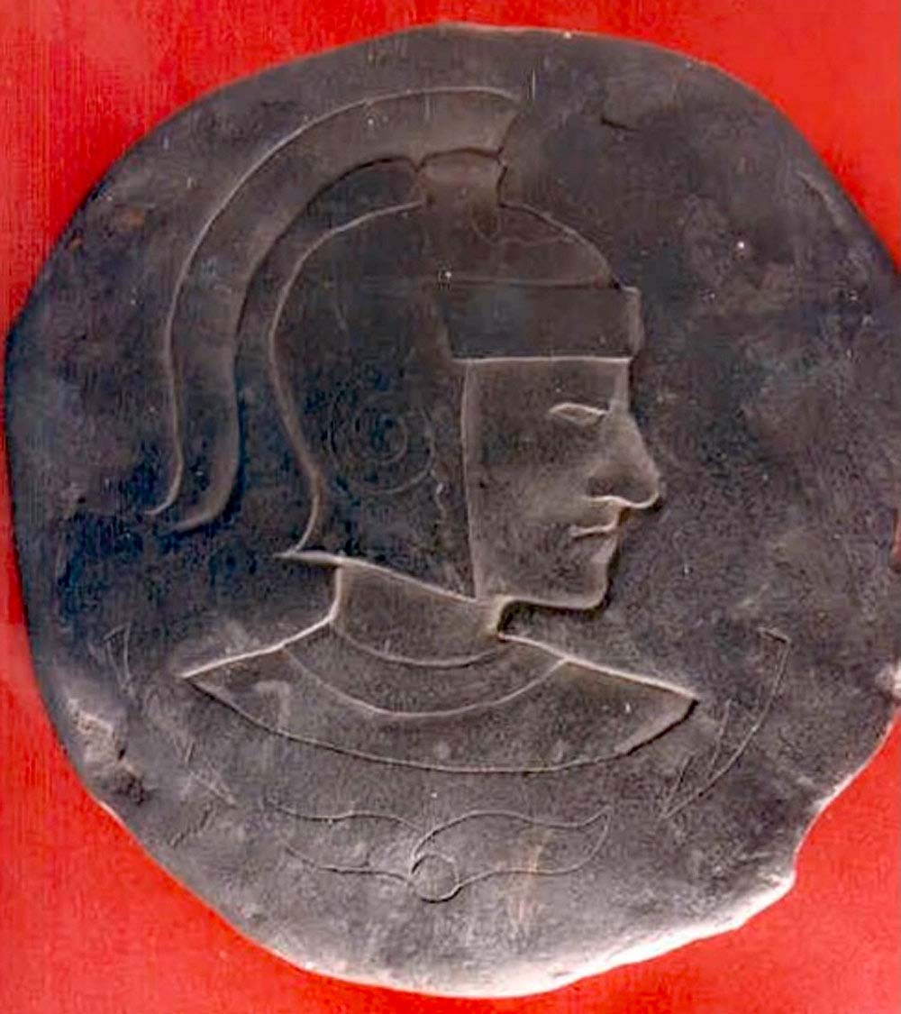 Etching of a man of authority with many Egyptian features. He wears an Egyptian crown (Uraeus) and carries a scepter in his left hand and an ankh (“life” or “key of life”) in his right hand and with a cartouche (contains a royal name) in front of him. Behind him, to the left, is a horn and trumpet. Additional unknown writing at the top.
