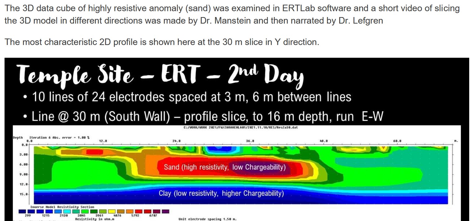 Note: The resistivity scan above is a full side profile scan to replace the original attempt which only showed one side. This scan shows the rectangular area of the sand foundation layer. The size of this underground structure si about 6 meters thick and 28 meters long.