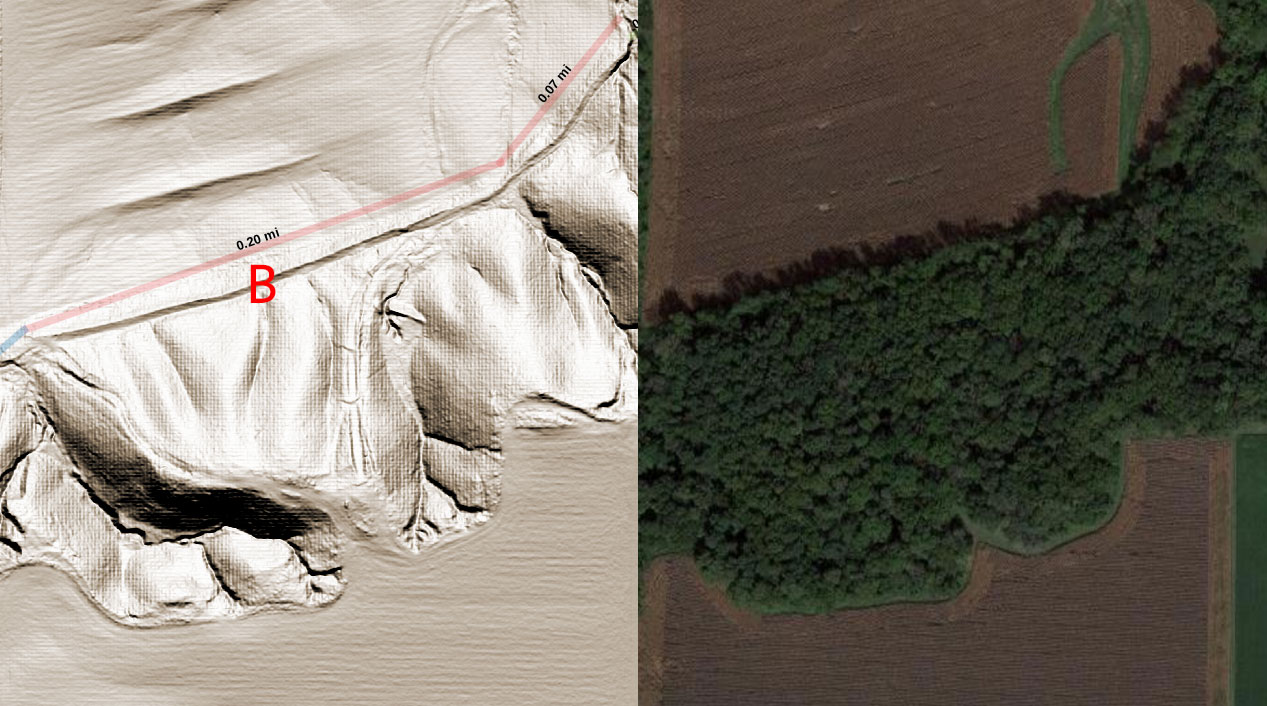 The image below shows a small section of the southern bluff that contains a distinct wall berm (B). LiDAR vs Satellite imagery of the same area is contrasted. Note that the berms detected in the field are