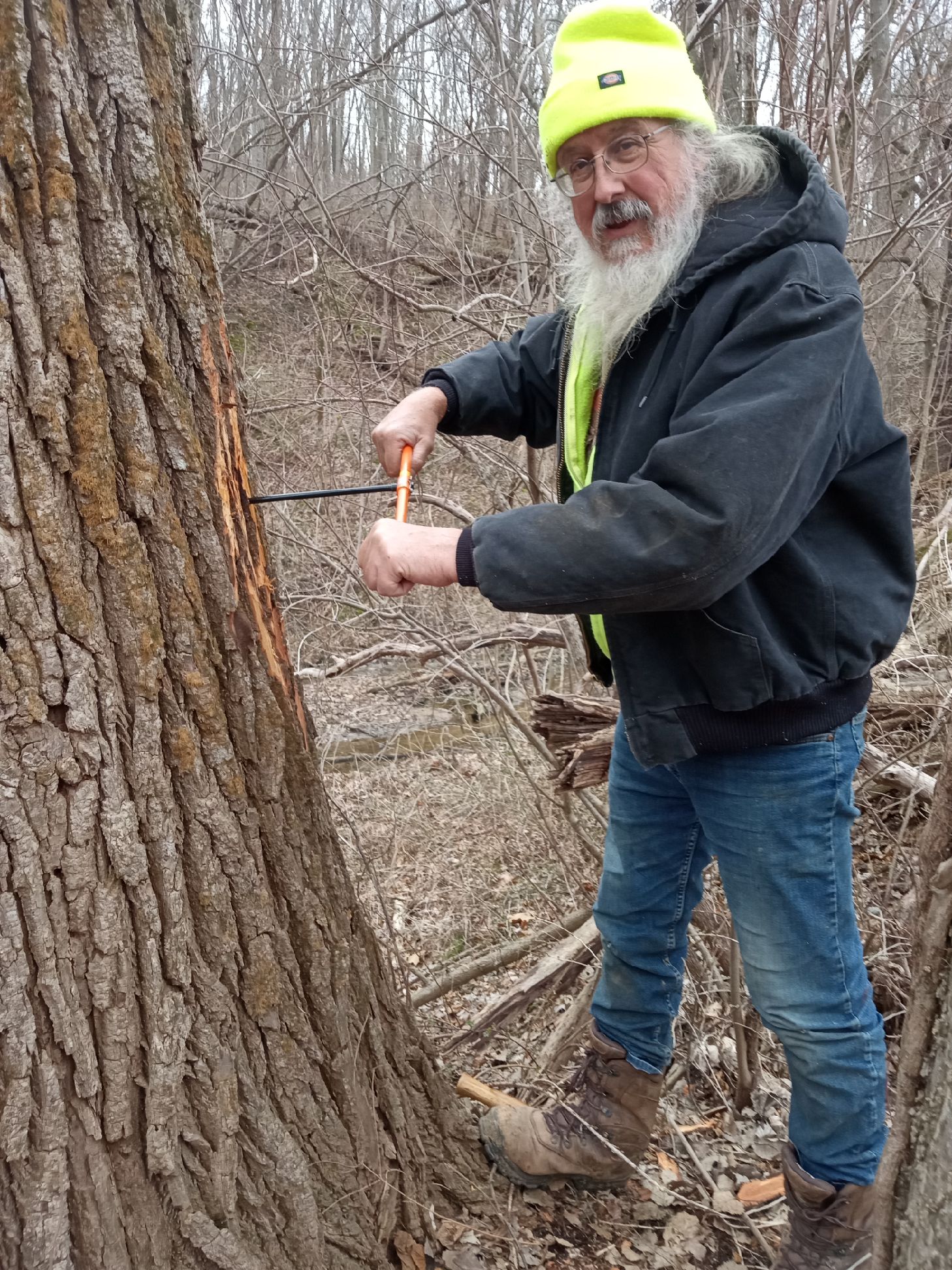 This is Mike Stahlman taking a tree core sample so the rings can be counted. The tree growing on the berm was 144 years old.