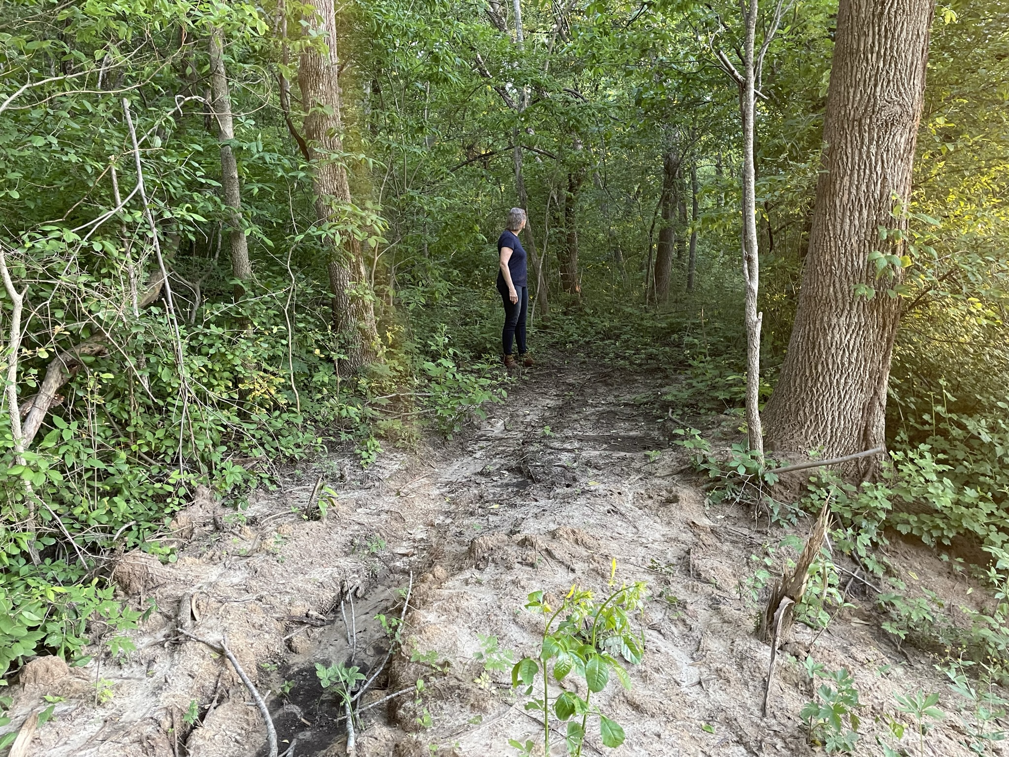 Someone walking along the top shows the overall shape of the Wayne May berm in an area that has been cleared of brush.