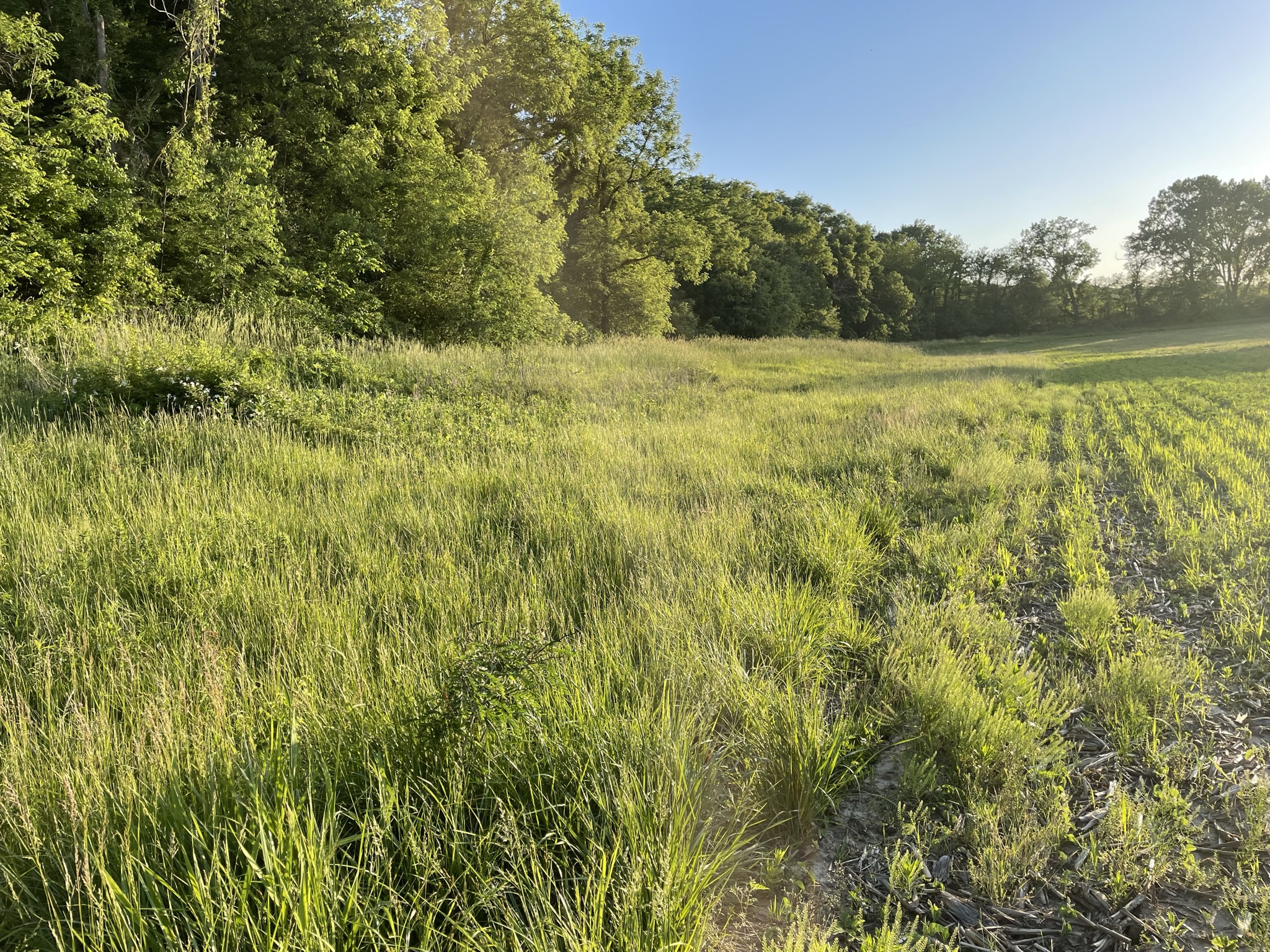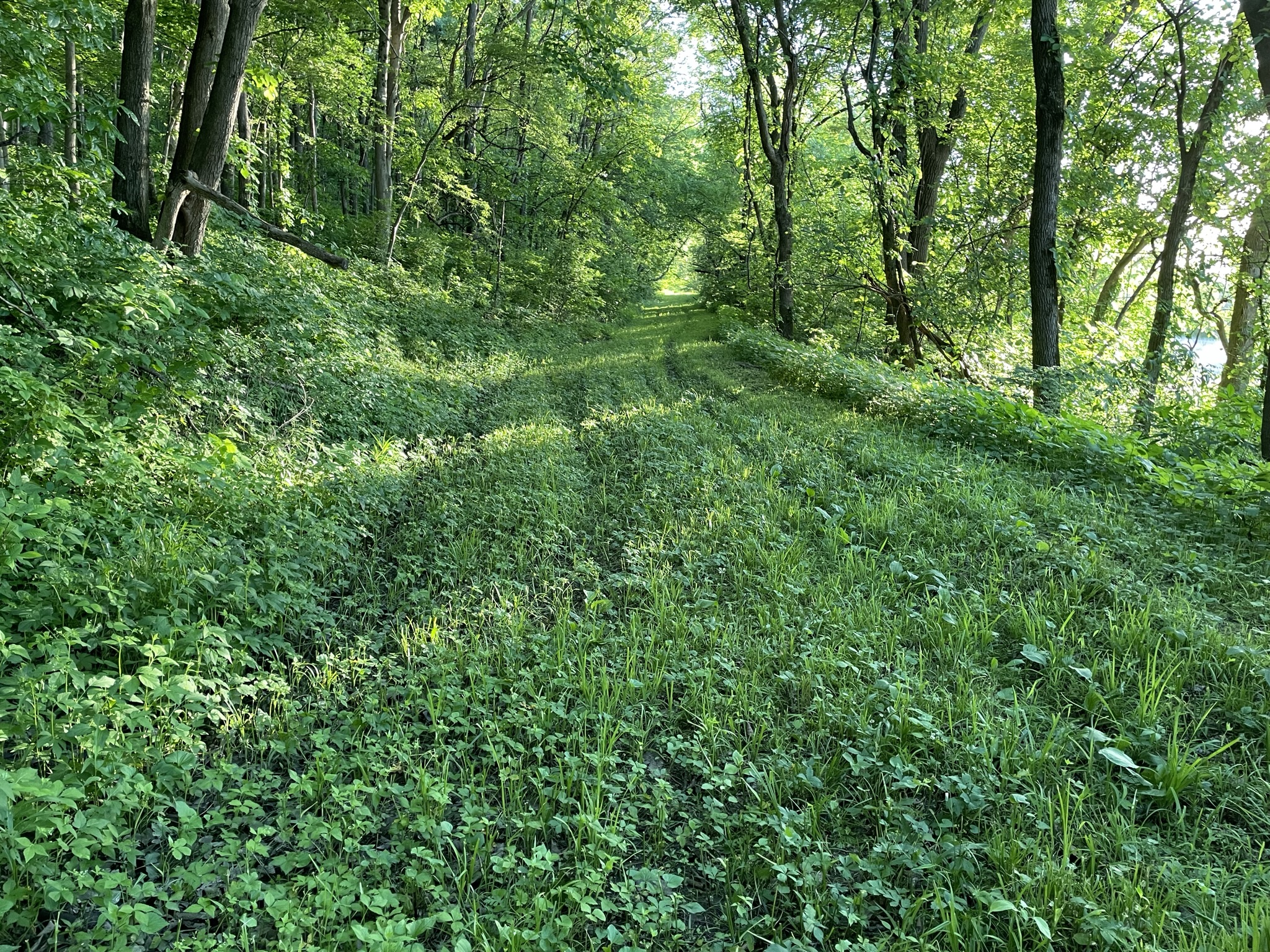 Looking west. The bluff is left to the south. Notice that the berm slopes south which shows it is man made. It is cleared off here for convenient tractor access to the north fields. This berm rises at this point about 30′ feet above the field.